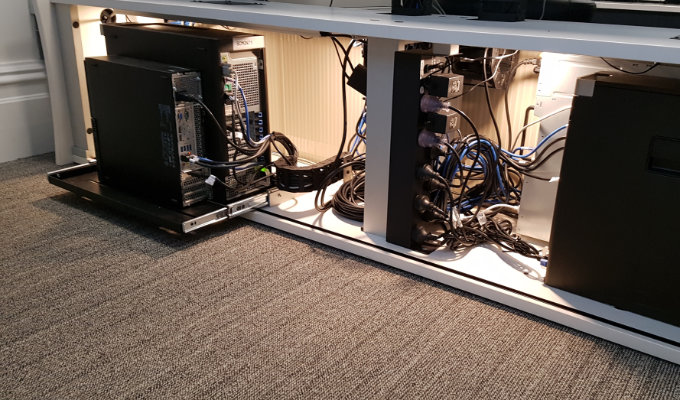 - Cable entry holes with cable covers for neatly routing cables to the rear monitor surface. - 1 x built in fan. - 1 x energy chain for safely running data cables from hardware cabinet to rear monitor surface. - 1 x energy chain for safely running power cables from hardware cabinet to rear monitor surface. - 1 x energy chain for safely running mixed cables from hardware cabinet to front work surface.