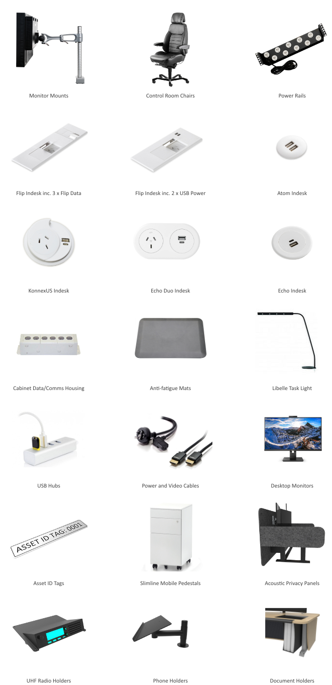 - Extensive range of optional accessories including; monitor mounts, control room chairs, softwiring plug-and-play power and data solutions for both the cabinet and work surface, anti-fatigue mats, task lighting, USB hubs, power and video cables, desktop monitors, asset ID tags, pedestal drawers, acoustic privacy screens, UHF radio holders, phone holders and document holders.